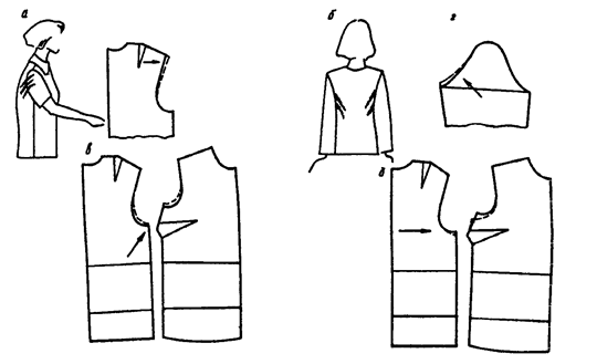 Затруднение отведения рук вперед (рисунок 11.13) возникает в том случае, если спина обужена в плечевом поясе (рисунок 11.13, а) или только в нижней части проймы (рисунок 11.13, б). Дефект усугубляется узким окатом рукава и неправильным оформлением проймы спереди (рисунок 11.13, в). Устранение дефекта предполагает увеличение ширины спинки, расширение рукава по окату (рисунок 11.13, г). Переоформление проймы переда выполняют также при ее малой глубине (рисунок 11.13, д).