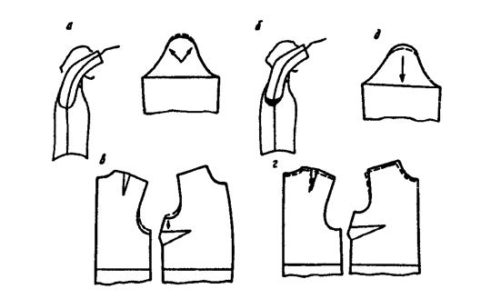 Затруднение подъема рук (рисунок 11.14) проявляется тогда, когда увеличена глубина проймы и обужен окат рукава (рисунок 11.14, а). Устраняют дефект введением ластовицы в нижней части узкого рукава (рисунок 11.14, б), расширением оката или уменьшением глубины проймы за счет запасов в нижней части (рисунок 11.14, в). В случае отсутствия запаса понижают верхний плечевой контур (рисунок 11.14, г) или уменьшают высоту оката рукава (рисунок 11.14, д).
