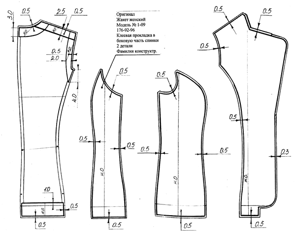 Чертежи лекал деталей клеевых прокладок в горловину спинки, плечевой срез и пройму разрабатываются по лекалу спинки. От среза горловины, проймы, плечевого и среднего срезов детали прокладок отстоят на 0.5см. Ширина прокладки в горловину спинки 3.0 см, в плечевой срез 2.5см, в пройму- 2,0 ÷ 3.0см. В области плечевого среза прокладки проектируются с заходом друг на друга. По боковому срезу ширина прокладки в пройму шире на 1,0 см.