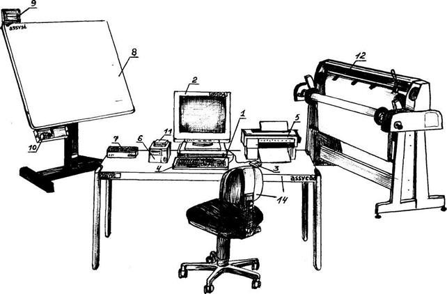| 1 – RISC – компьютер НР90СХУ712/60; 2 – цветной монитор 17'΄ или 19" разрешение 1280x1024; 3 – трехкнопочная мышь; 4 – клавиатура; 5 – принтер, формат А4; 6 – стример 2гб; 7 – 8-ми портовый терминал-сервер; 8 –дигитайзер; 9 – жидко кристаллический экран дигитайзера для контроля ввода данных с дигитайзера; 10 – бесшумный 16-ти кнопочный курсор для ввода данных с дигитайзера; 11 – модем; 12 – рулонный перьевой плоттер SUMMIT, рабочая ширина 180 см; 13 – лицензированный пакет программного обеспечения модулей CAD и LAY; 14 – мебель |