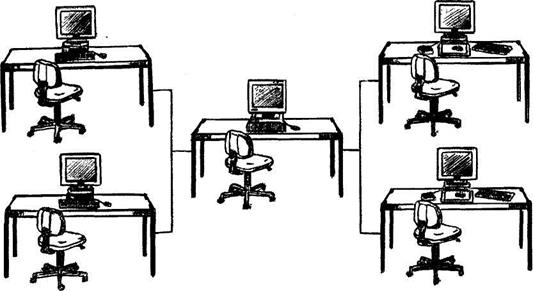 В состав САПР входит ЭВМ, которая имеет необходимый и достаточный объем памяти. Обычно используется так называемая миниЭВМ. Мини-ЭВМ - это компьютер, занимающий промежуточное положение между персональным компьютером и мэйнфреймом, (Мэйнфреймы - компьютеры, созданные для обработки очень больших объемов информации). Мини-ЭВМ имеют производительность как у самых мощных персональных компьютеров или даже несколько больше. Обычно в этом случае используется сеть рабочих мест, где вводятся данные, и получается результат (рисунок 13.2). На этих рабочих местах (их называют X-терминалами) устанавливается не персональный компьютер, а более дешевый неинтеллектуальный терминал (монитор и клавиатура). В то же время данные хранятся на мини-ЭВМ, ее называют сервер и она является носителем базы данных для всей системы. Такая структура удобна тем, что при необходимости увеличения объема памяти системы придется наращивать только память сервера, X-терминалы остаются без изменений. Экономически это более выгодно, чем, если бы персональный компьютер стоял на каждом рабочем месте.