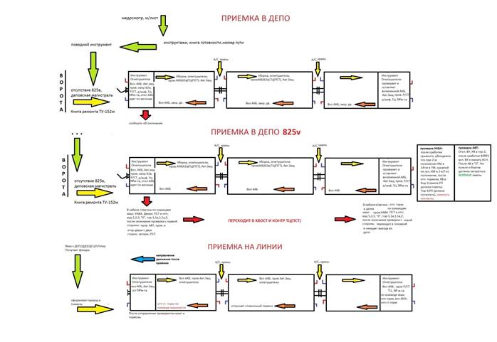 Машинист выясняет, была ли запись в книге ремонта при постановке состава, есть ли подпись ответственного работника о выполнении ремонта и о готовности состава к выдаче на линию. При отсутствии подписи о выполнении ремонта и готовности состава локомотивная бригада (машинист) к приемке состава не приступает, о чем заявляет дежурному по электродепо.