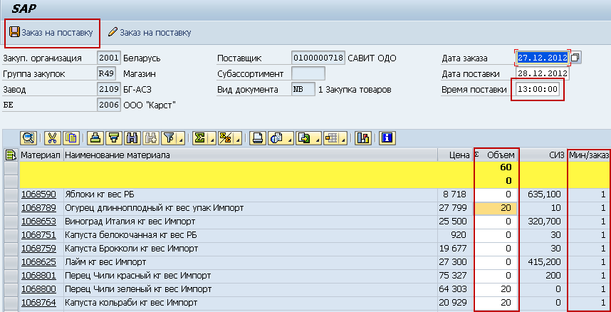 В появившемся окне проставляем объем заказа, учитывая минимальный заказ и СИЗ (свободно используемый запас). Указываем дату поставки. Сохраняем заказ.
