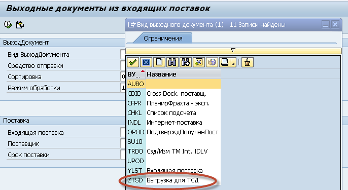 , откроется список видов выходных документов, в котором нужно выбрать именно ZTSD – Выгрузка для ТСД: