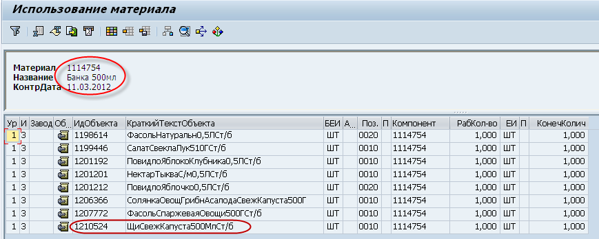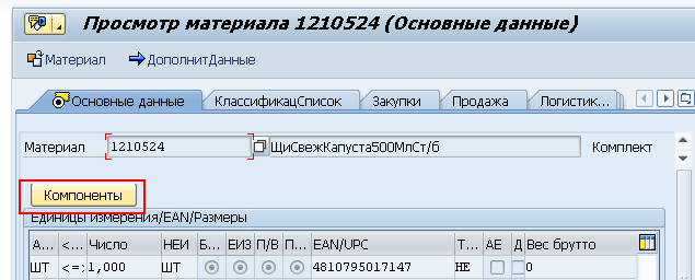 При помощи транзакции MM43 можно просмотреть состав комплекта. При поиске материала указываем критерий поиска «Материал к типу материала».