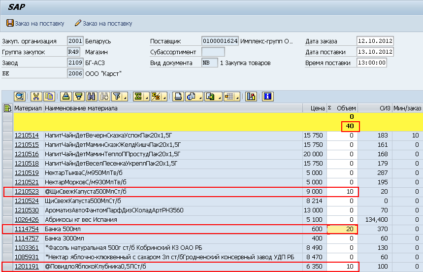 Создаем заказ на поставку, используя транзакцию ME21N. В заказ добавляются составляющие комплекта, т.е. содержимое и банка (бутылка). Количество должно быть одинаковым.