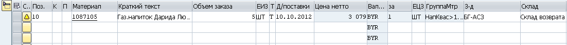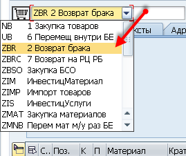 1. Выбираем из выпадающего списка Вид заказа на поставку – Тип заказа ZBR – Возврат брака (если причина возврата брак), или ZSR – Прочие возвраты (если возвращаем тару, товары, закончившейся акции). В нашем примере будем возвращать по причине – брак.