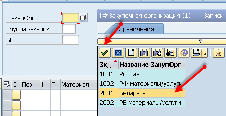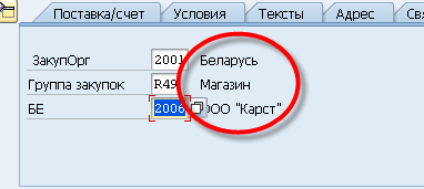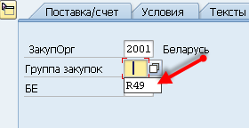 В закладке «Организационные данные», указываем ЗакупОрг, Группа закупок, БЕ: