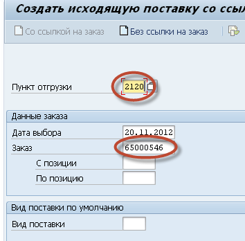 Для создания исходящей поставки к сбытовым заказам используется транзакция VL01N. В ней нужно указать: