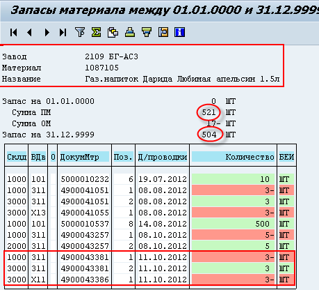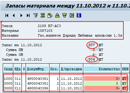 При помощи отчета MB5B (см. тему Запас на дату проводки), задав параметры для поиска по номеру материала, БЕ и заводу, а также указав дату выбора (или можно не указывать) можно просмотреть изменение запаса материала.