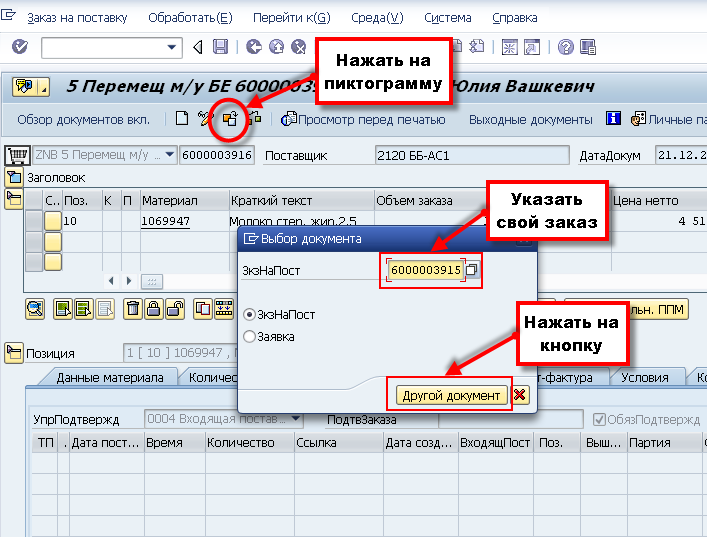 Выбираем свой заказ на перемещение с помощью пиктограммы