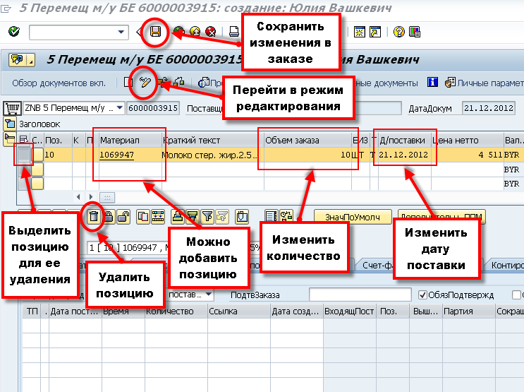, после этого поля в заказе на поставку станут доступными для изменений. Далее внесите все изменения в заказ. Для добавления новых позиций в заказ добавьте их в конце списка. Все поля, выделенные белым цветом, мы можем изменить. Для удаления позиций выделите необходимую позицию (строчка будет выделена желтым цветом) и нажмите
