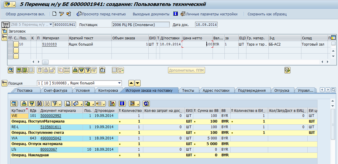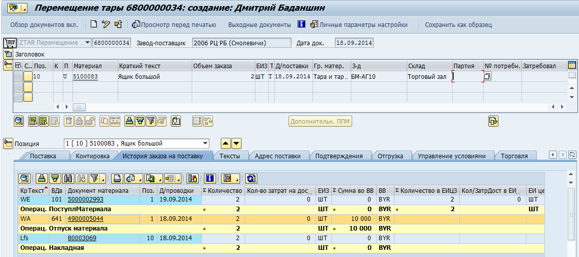 В случае если сотрудник РЦ 2006 создает заказы на магазины БЕ 2002, 2102 или 2202, он использует схему бизнес-процесса «Создание заказа на перемещение внутри БЕ». Единственным отличием является вид заказа - ZTAR Перемещение тары.