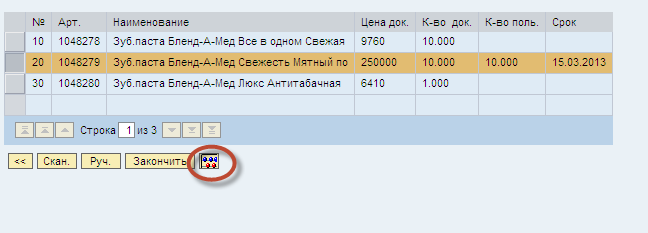 Когда закончена приемка всех наименований в ТТН, в пустом поле, не внося штрихового кода, нажимаете «Найти»: