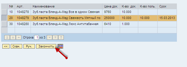 Если все данные правильно внесены, и необходимо закончить приемку по данной ТТН, нажмите «Назад». В окошке со списком товара, надо нажать «Закончить»: