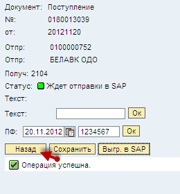 Здесь ставим дату накладной, вносим номер накладной и нажимаем «Выгрузить в SAP»: