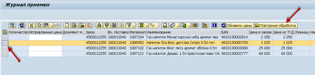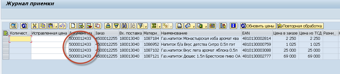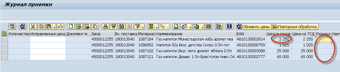 Теперь, если заново сформировать журнал приемки по тем же параметрам, в поле «Цена в заказе» появится другая цена, а в поле «Разница» ничего не будет отображаться:
