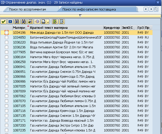 · Поиск по инфо-записям поставщика – поиск по поставщику (чтобы выбрать Поставщика см. раздел Поиск остатков по одному наименованию материала):