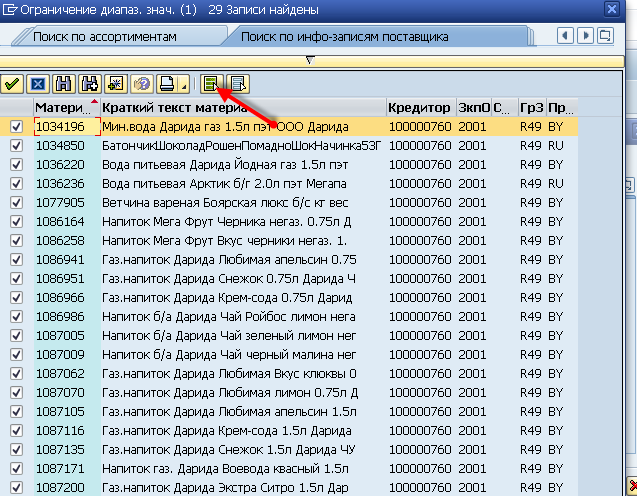 Или, если необходимо полностью просмотреть остатки по поставщику, нажать на пиктограмму «Выделить все»: