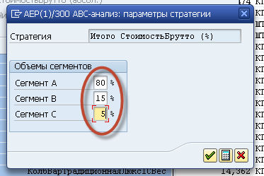 Далее необходимо указать процентное соотношение позиций А, В, С (согласно правилу Парето это будут следующие цифры: А – 80%, В – 15%, С – 5%), по умолчанию программа предложит: А-70%, В-20%, С-10%.