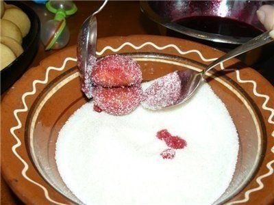 Наполнить сферы, склеить в виде персика. Затем каждый персик обмакнуть с сок (или варенье) смородины и пока мокрое обвалять в сахаре.