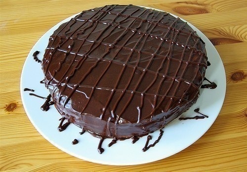 4. Крем делается следующим способом – слегка размягченное масло смешивается с вареной сгущенкой и тщательно взбивается. Пропитайте оба коржа сырой сгущенкой и потом перемажьте кремом из вареной, украсьте глазурью.