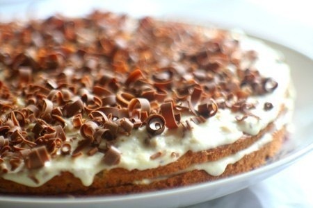 5. На нижний корж выкладываем 23 крема, разравниваем, накрываем вторым коржом и смазываем оставшимся кремом. Шоколад натираем на терке или делаем шоколадную стружку с помощью овощечистки и посыпаем ей торт сверху. Отправляем торт в холодильник пропитываться минимум на 8 часов.