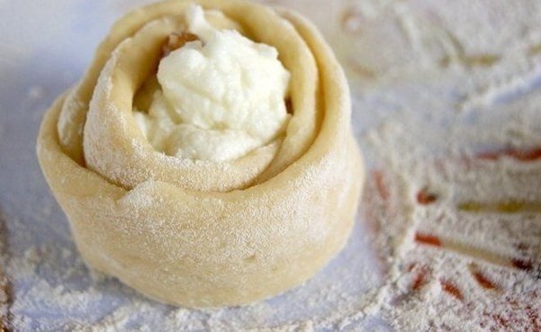 Одну из трёх частей (самую маленькую) оборачиваем вокруг творога и скрепляем.