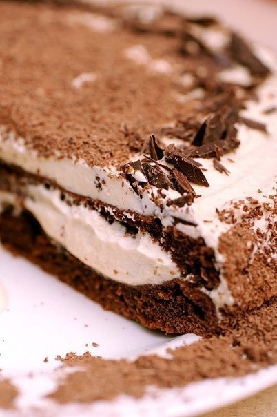 5. Собираем торт: ставим первый корж, затем сливки, корж, смазываем все оставшимися сливками и посыпаем тертым шоколадом.