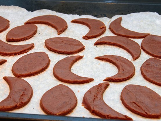 4. Достаньте тесто, вырежьте из теста будущее печенье (с помощью формочек или стакана).