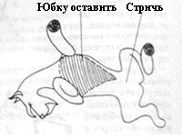 «Юбка» - подстригается ножницами так, чтобы образовывала в профиль прямую линию, полого поднимающуюся из-под локтя к паху. Для кобелей эту линию нужно сориентировать на самую высокую точку препуциальной связки.
