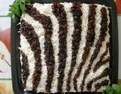 | Приготовление Мелко нарезать лук, чернослив, на терке потереть морковь и свеклу. Пропустить чеснок через пресс и перемешать его с майонезом. Выкладывать новогодний салат слоями: лук, свекла, морковь, чеснок с майонезом. Перед подачей на новогодний стол оформить салат новогодний «Зебра удачи» в виде зебры, потерев сверху сыр и сделав на нем полоски из мелко нарезанного чернослива, охладить и оформить зеленью.