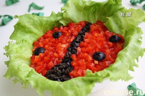 В начале уложить в салатник листья салата, затем сам салат. У маслин отрезать кончики для кружочков на "крыльях". Затем измельчить маслины. Выложить на салате "голову" и "дорожку" божьей коровки. Затем мелко нарезать перец и выложить "крылья". В самом конце положить кружочки. Из капель майонеза можно сделать глазки.