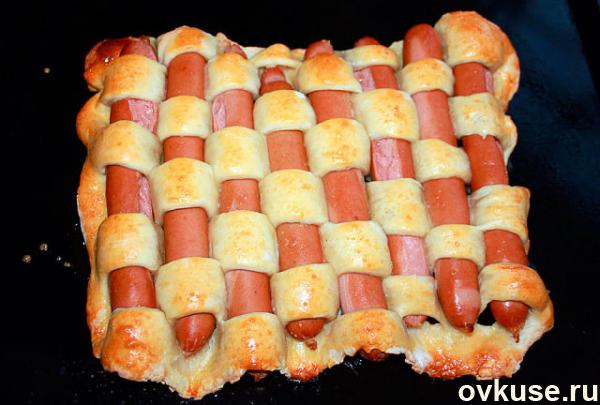 Любое тесто (дрожжевое или слоенное) раскатать в пласт. Порезать полосками не до конца. Переплести сосиски. Смазсть яйцом. Выпекать в духовке до готовности. И... наслаждаемся жизнью!!!