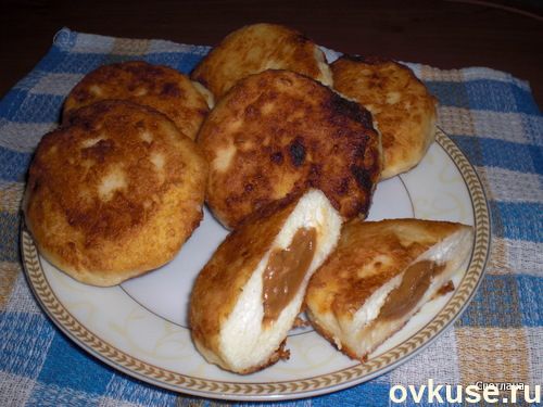 Мокрыми руками делаем лепёшку, кладём начинку и закрываем сверху второй лепёшкой. Формируем сырник и обваливаем в муке.