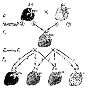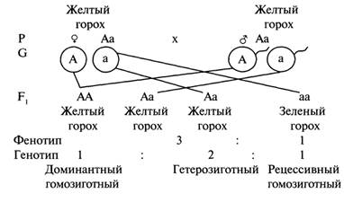 При скрещивании гетерозиготных гибридов первого поколения между собой (самоопыления или родственное скрещивание) во втором поколении появляются особи как с доминантными, так и с рецессивными состояниями признаков в соотношении 3:1 по фенотипу и 1:2:1 – по генотипу.