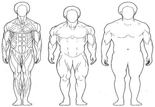 Задание: обратите внимание на критерии, отличающие один тип телосложения от другого: длина конечностей, торса, мышечный покров и его тонус, форма отдельных частей тела, жировые отложения и т.п. (табл. 1)