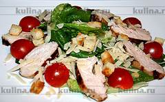 Выложить кусочки курицы на листья салата. Черри разрезать на две части и выложить на салат. Посыпать салат крутонами, тертым пармезаном и подать к столу. Приятного аппетита!