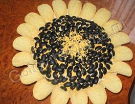 Режем маслины на 4 части и сверху укладываем на салат. Салат ставим в холодильник на 12 часов, перед подачей на стол по краям салата разложить чипсы в форме подсолнуха и в серединку посыпать тертый желток.