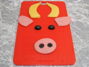 На блюдо выложить филе в виде бычьей головы, посолить.