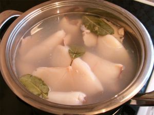 Воду довести до кипения, положить лавровый лист, кальмары и кипятить ровно 3 минуты (если кипятить дольше, кальмары станут жесткими и невкусными).