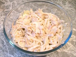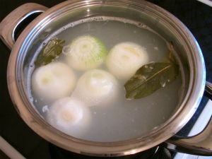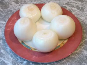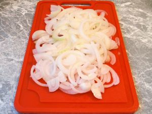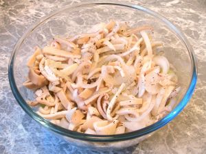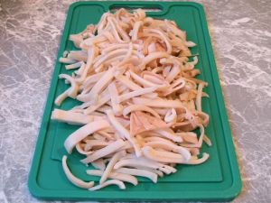 Готовые кальмары вынуть и в горячую воду из-под кальмаров положить лук на 10-15 минут, это делается для того, чтобы лук стал мягким и не горьким.