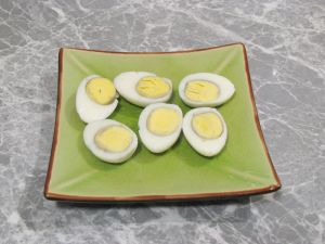 Перепелиные яйца разрезать на 2 части (куриные на 4-6 частей).