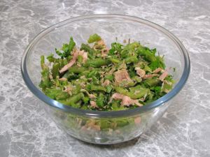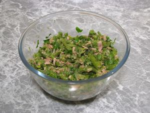Смешать фасоль, тунца (жидкость слить), зелень. Немного посолить, поперчить.
