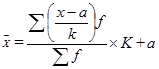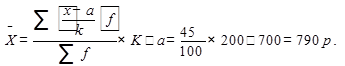 Далее необходимо выбрать значения kи a. Ими могут быть любые произвольные величины, но для удобства расчета за a обычно принимают размер варианта при наибольшей частоте, а за k– размер интервала, т.е. по условию a= 700, k= 200 (во всех группах одинаковый интервал). Далее решаем по формуле, подстраивая гр. 4,5,6.