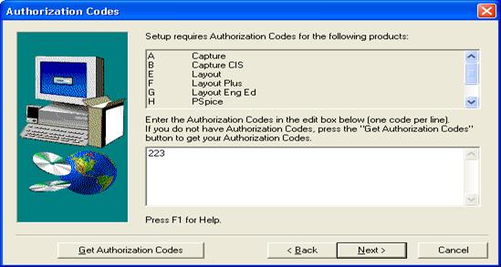 В начале установки предлагается ввести коды (Key Codes) устанавливаемых модулей системы (рис. 1.2) и после этого ввести код авторизации (Authorization Code). Для установки максимальной конфигурации достаточно установить 4 модуля: Capture CIS, Layout Plus, PSpice A/D (сюда входит программа моделирования PSpice и схемный редактор PSpice Schematic), PSpice Optimizer. Каждому модулю соответствует отдельный код.