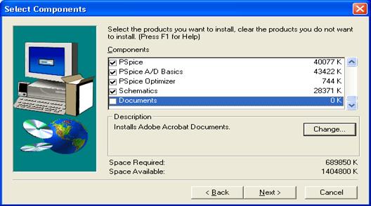 - Typical — типичная установка, занимающая на диске 326 Мб. Устанавливаются все программы, за исключением PSpice Schematics, и все библиотеки, не устанавливается электронная документация;