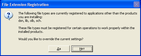 В заключение предлагается в нескольких диалоговых окнах (рис. 1.6) нажатием на панель Да подтвердить необходимость загрузки соответствующих программ двойным щелчком курсора на именах файлов, имеющих расширения dsn, lib, olb, sch, chm, cig, drc, edn, exp, flp, map, net, pld, rpt, swp, upd, v, vhd, xrf, bom, cir, dat, out, sim, stl (назначения этих файлов даны в Приложении 2). В случае, если ряд расширений уже зарегистрирован за другими программами, следует нажать на панель Нет.