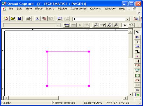 У некоторых графических объектов, таких как проводники, шины (линии групповой связи), линии, эллипсы (в частности, окружности), прямоугольники и многоугольники, можно изменять размеры и форму. Все остальные объекты можно только передвигать, вращать, зеркально отображать и удалять. Редактируемые объекты предварительно нужно выбрать — в результате для каждого выбранного графического объекта на экране изображаются специальные значки (см. рис. 2.15). Для изменения формы или размеров графических объектов нужно щелкнуть левой кнопки мыши при расположении курсора на одном из этих значков и затем, не отпуская кнопку, переместить соответствующим образом курсор; редактирование завершается 1 отпусканием левой кнопки мыши. Для перемещения любого выбранного объекта нужно щелкнуть левой кнопкой мыши при расположении курсора в любой точке на контуре объекта, за исключением этих значков, и затем, не отпуская кнопку, выполнить перемещение. При перемещении группы объектов курсор изменяет свою форму (он принимает форму звездочки), и его можно расположить в любой точки внутри контура, окаймляющего выбранную группу.
