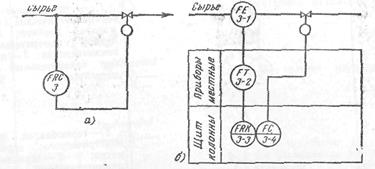 Задание: На рис. 4, а изображен участок технологического трубопровода, на котором упрощенным способом показан функциональный узел автоматического регулирования расхода технологического сырья Расшифруйте функциональное назначение всех приборов на рис.4.